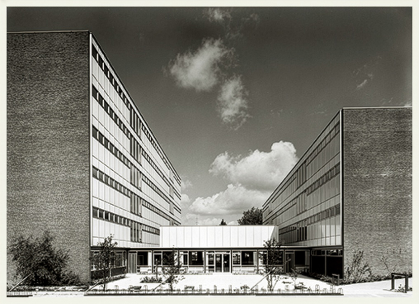 Der zweite Bauabschnitt ist fertig (Aufnahme 1965): rechts der Trakt an der Hauffstraße, links der heutige mittlere Gebäudetrakt.