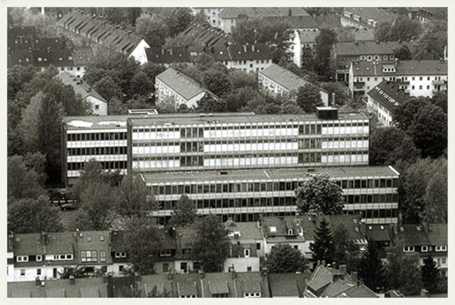Blick vom Waller Fernsehturm (Aufnahme Mitte der 90er Jahre): vorne der Gebäudetrakt an der Hauffstraße, dahinter der mittlere Trakt, dahinter der 1974 fertiggestellte sogenannte Neubautrakt.