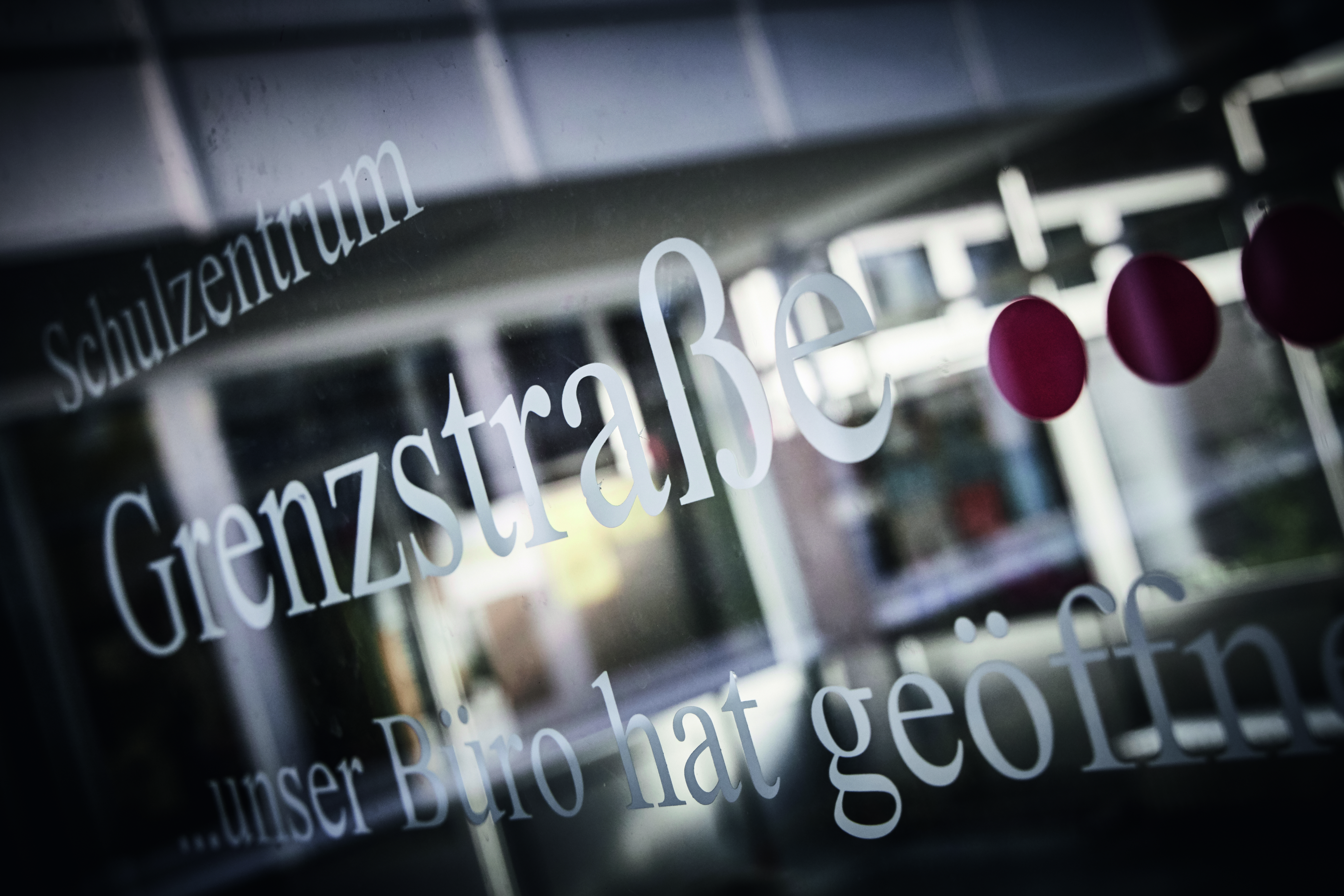 Eingang Schulzentrums Grenzstraße monochrom rot · LIS ZfM Bremen, Michael Schnelle