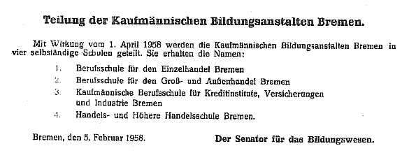 In der Nachkriegszeit wurde die Schule zunächst als Abteilung der kaufmännischen Bildungsanstalten Bremen geführt. Mit Wirkung vom 1. April 1958 wurden die Kaufmännischen Bildungsanstalten in vier selbständige Schulen aufgeteilt. Darunter befanden sich mit der Kaufmännischen Berufsschule für Kreditinstitute, Versicherungen und Industrie sowie der Handels- und Höheren Handelsschule jene Schulen, die später zum Schulzentrum Grenzstraße werden sollten.